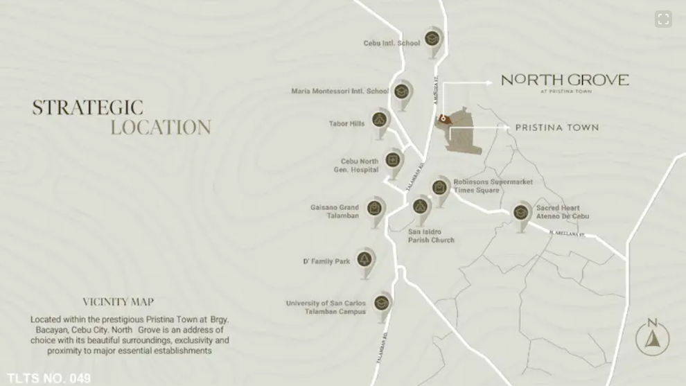 North Grove, located in the prestigious Pristina Town in Barangay Bacayan, Cebu City, offers a perfect balance of serenity, exclusivity, and convenience. Its prime location provides easy access to major destinations within Cebu City and beyond.